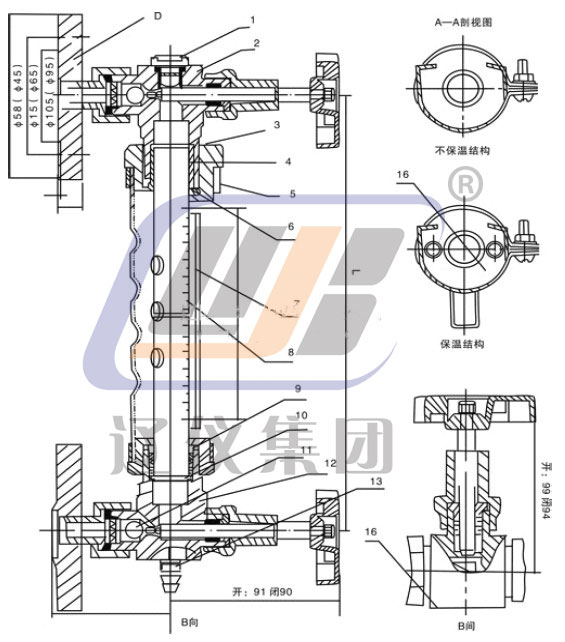 9.壓蓋螺母 10.底環(huán)‖ 11.鋼球 12.下閥 13.排污接頭 14.保溫管 15.平焊法蘭 16.標牌